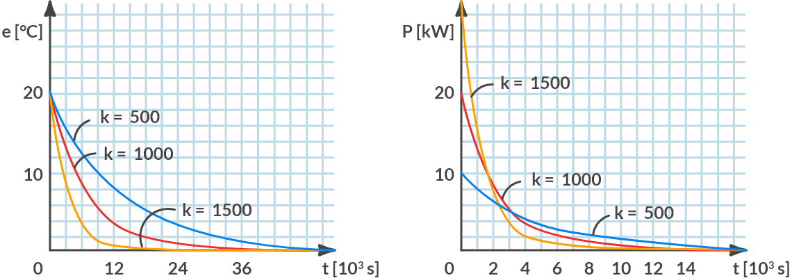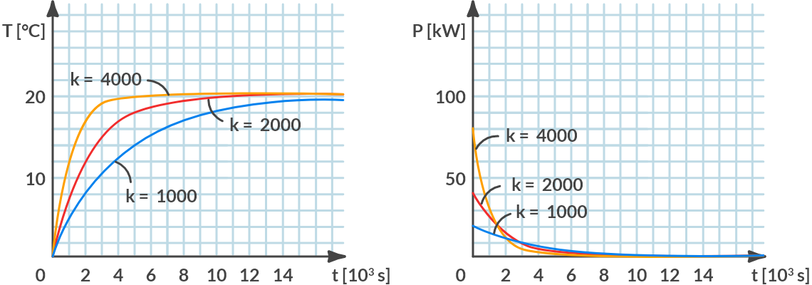 For \(k = 4000 \textrm{ W/°C}\), the heating must provide a maximum power at \(t = 0\) s of \(80000\) W.