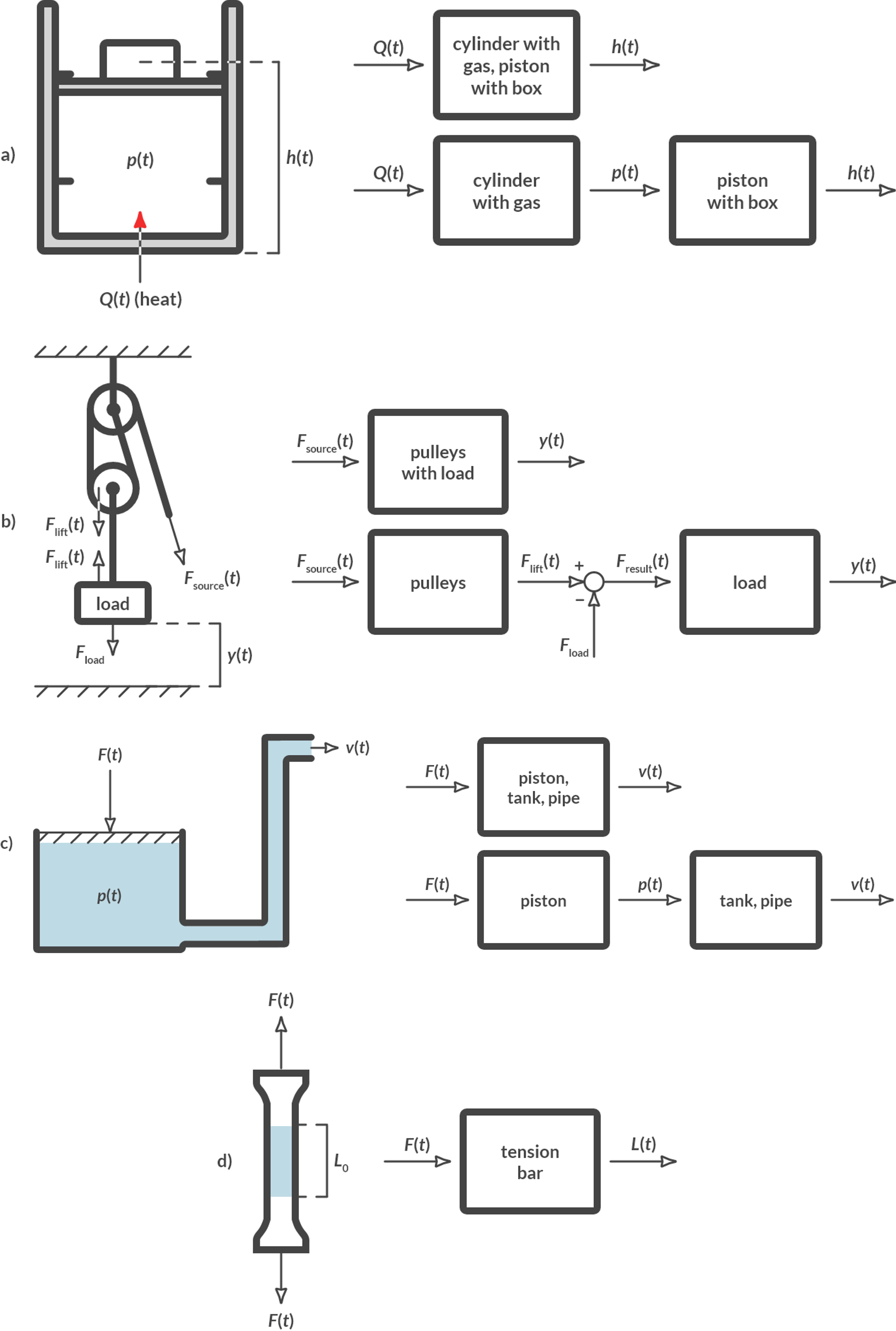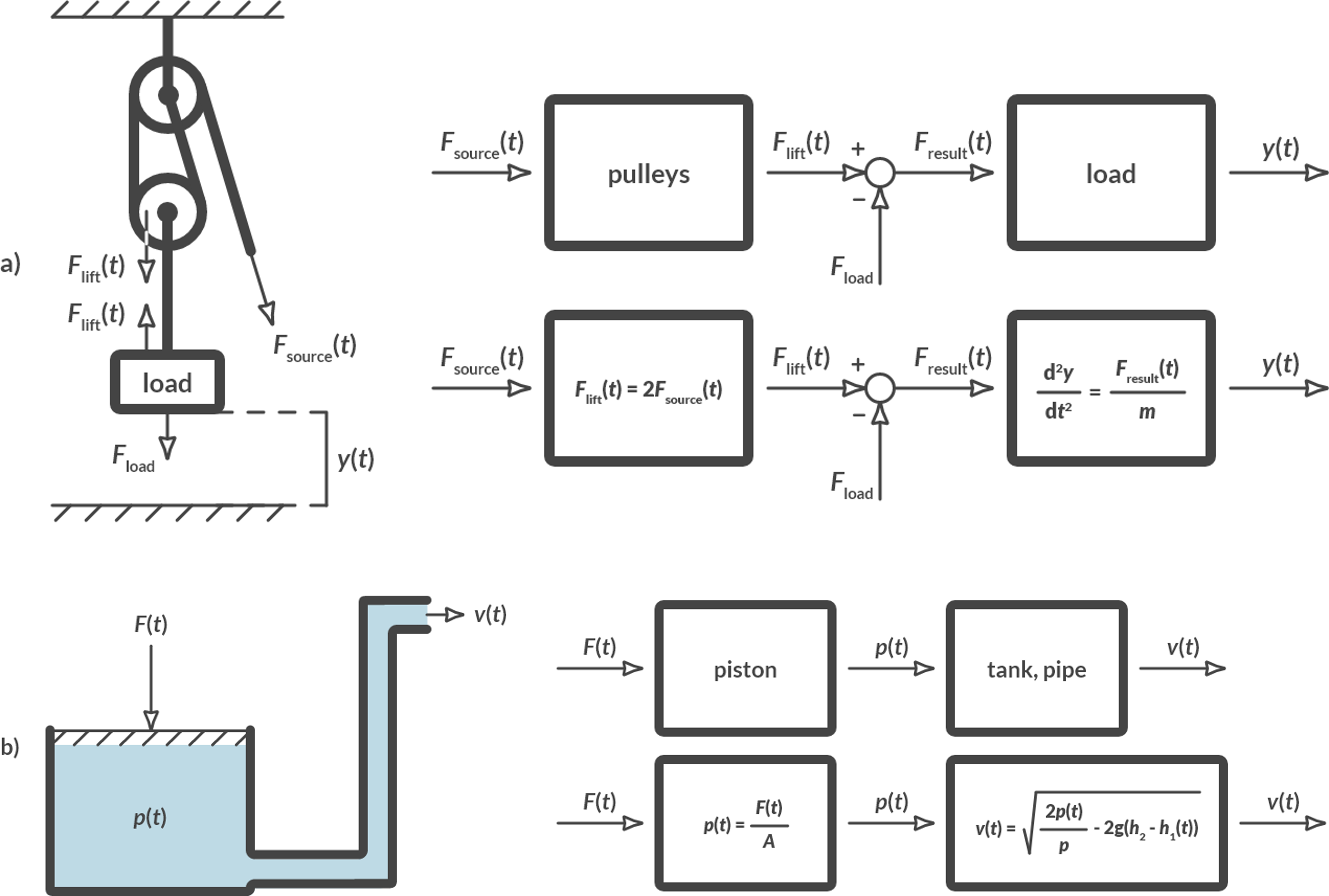The block functions describe the relationship between the input and the output. Fig. 6.3 describes this relationship qualitatively. In Fig. 6.3(b), the block function pulleys describes how the input force results in a lifting force on the mass. To quantitatively describe such a relationship, we use a model of physical reality. For simple systems, that model can be a simple equation. For many systems the relationship is described with differential equations (equations in which in addition to variables also derivatives of those variables occur over time).