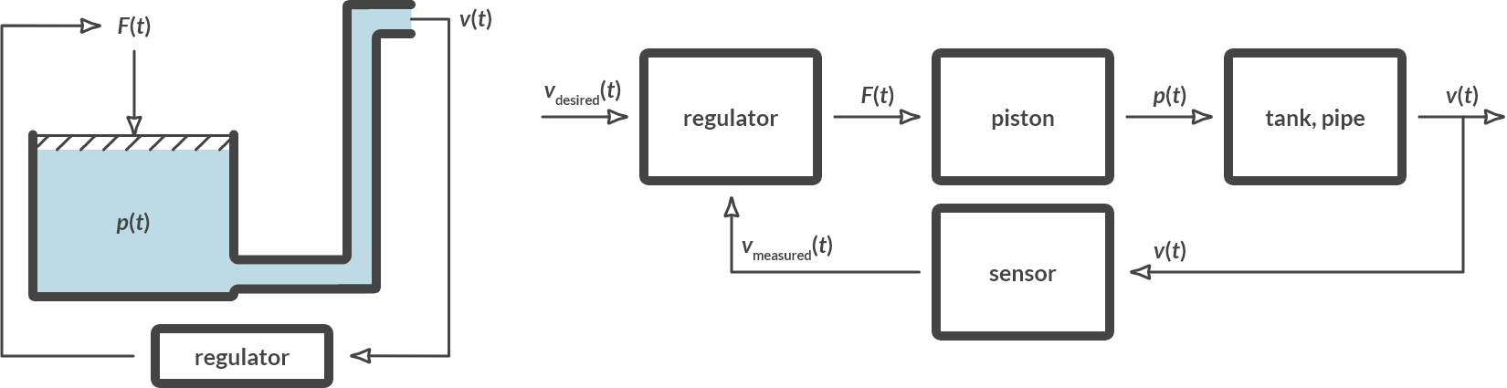 Fig. 6.5 shows the control loop on the left in a schematic representation of the physical system. The block diagram is shown on the right.