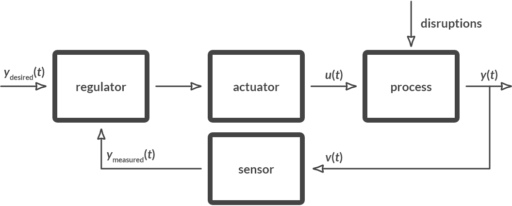 An interesting thought is that the relevant considerations for the design of a control system naturally have a lot to do with the design of the process itself (and also which inputs and outputs are useful), as well as the design of the actuator and sensor. The integrated approach to the design of regular mechanical devices is also called “mechatronics”. This will be discussed in detail in later courses.