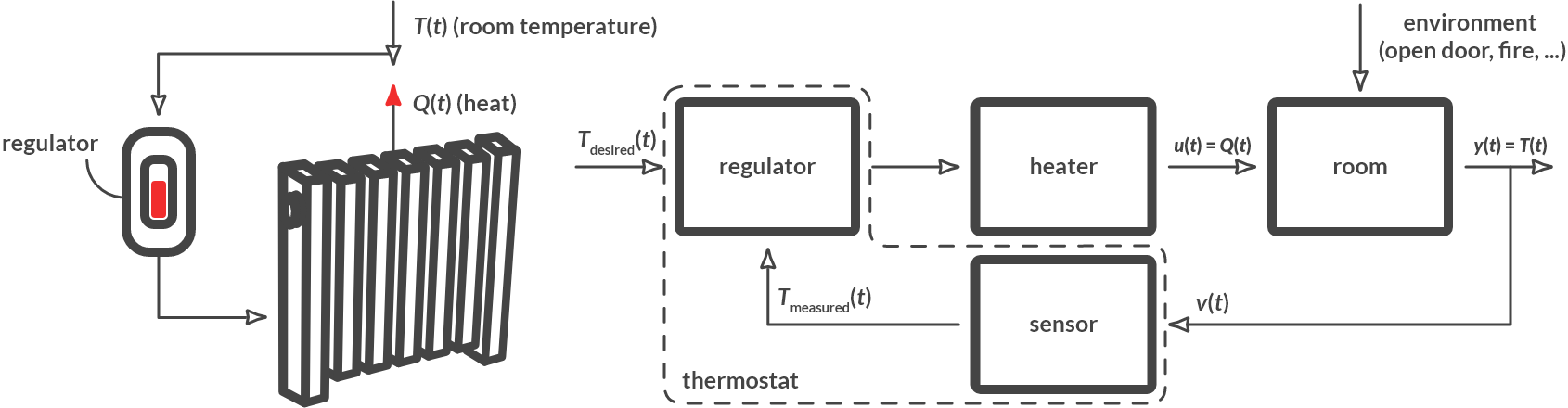 Examples of disruptions are the heat losses to the outside (if the outside temperature changes), the opening of the outside door or the lighting of a fire in the fireplace. The thermostat contains both the sensor and the controller.
