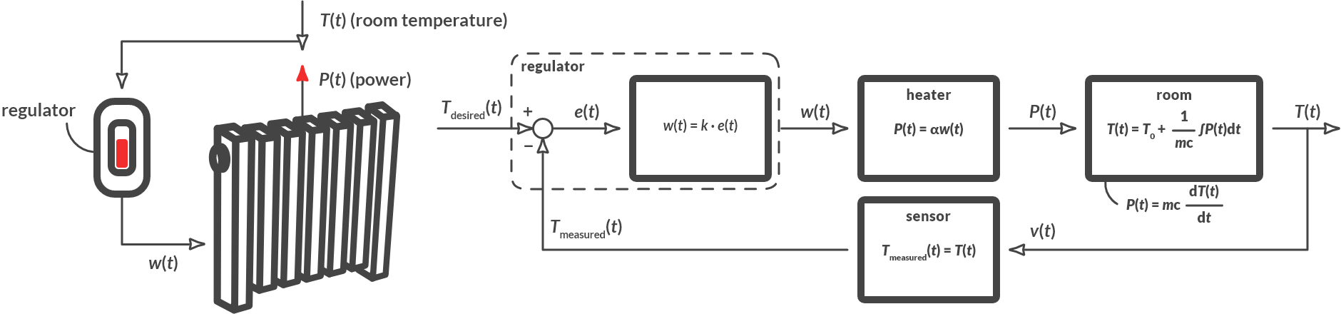 If \(T_{\text{meas}}(t) > T_{\text{des}}(t)\), it is too hot. The controller gives output signal \(w(t) < 0\). The heating produces a negative power (extracts heat) \(P(t) < 0\). The temperature decreases.