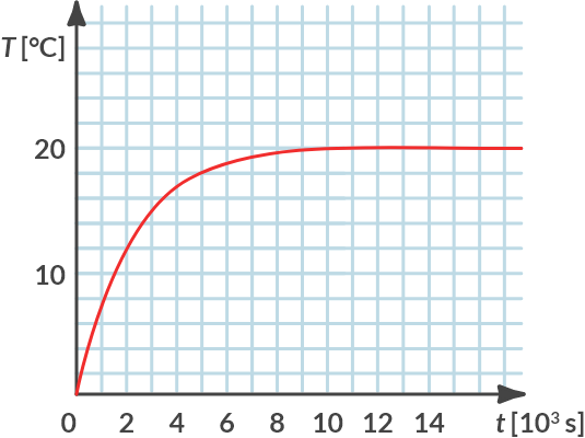 We see that it takes a certain time until the desired temperature of 20 °C is reached (approached). At \(t = 12 \cdot 10^3 \textrm{ s}\) the temperature has risen to \(T = 19.63 \textrm{ °C}\).