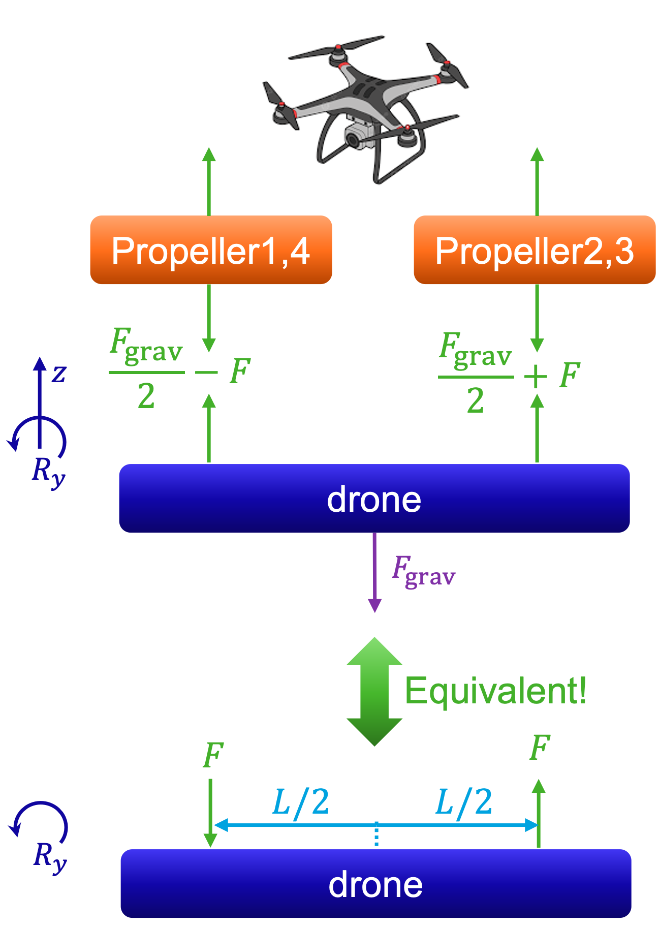 Because of the assumptions, the drone schematics can be simplified to the bottom schematic in Fig. 6.16. Note that we removed the \(z\) and \(R_z\) axes indication. Instead, in the following questions, we will focus on a new rotation axis: \(R_y\).