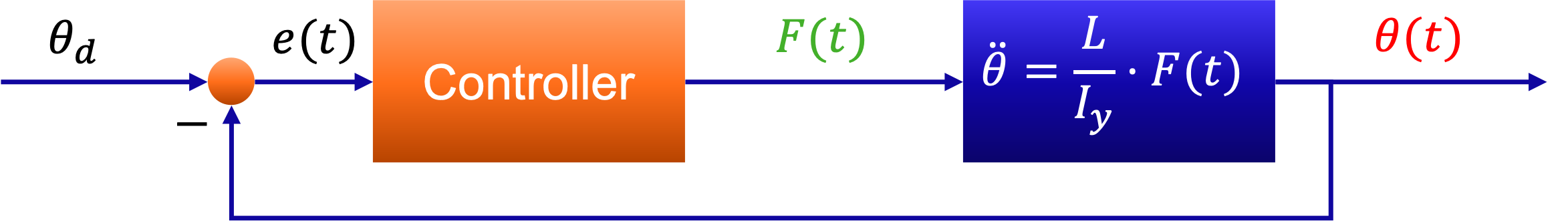 To avoid making this exercise an MSc project, let us introduce a final simplification: \(F_{\textrm{true}}(t) = F(t)\), i.e., the propellers generate exactly the force we ask for, and \(\theta_{\textrm{meas}}(t) = \theta(t)\), i.e., the sensor measures the actual rotation exactly. This leads to the following simplified control scheme visible in Fig. 6.19 below.