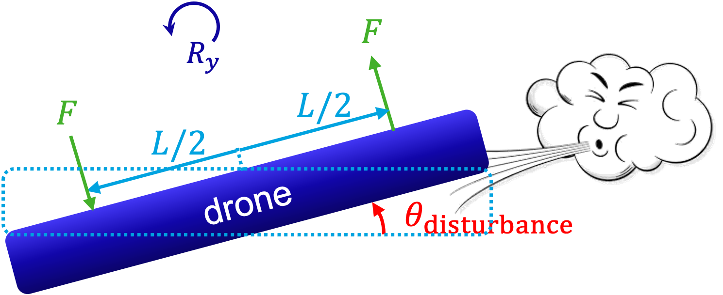 Fig. 6.25 Schematic of the wind gust disturbance where a lateral gust imposes an initial tilt \(\theta_{\text{disturbance}}\); equal lift forces \(F\) applied at \(\pm L/2\) about \(R_y\) produce a restoring roll response.#
