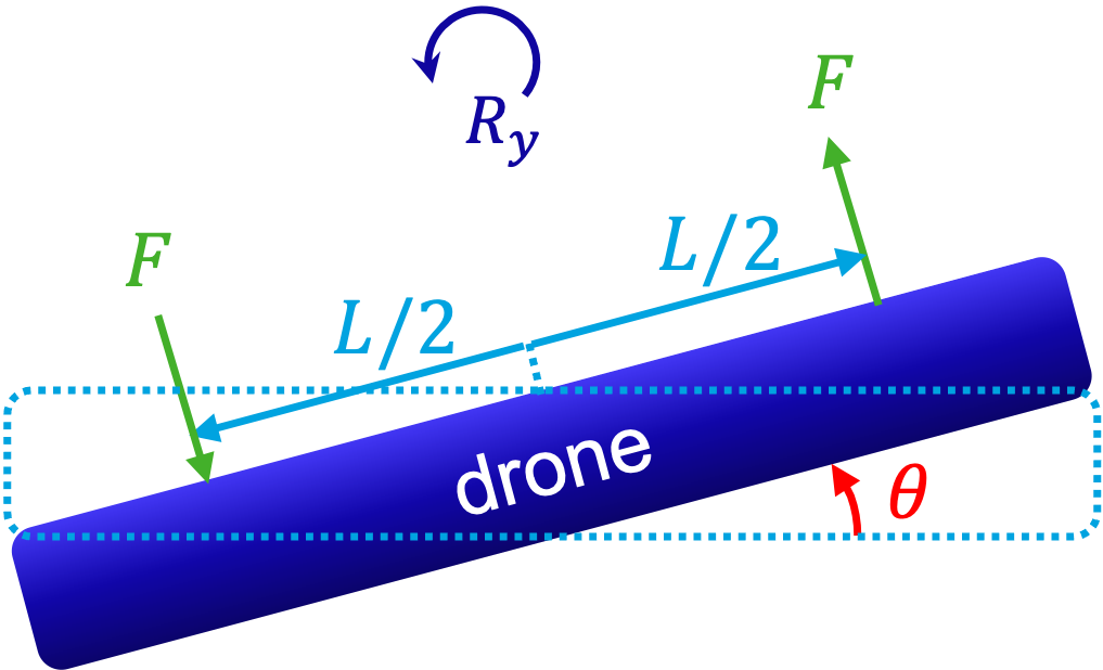 Fig. 6.22 Roll about \(R_y\) from differential lift: two upward forces \(F\) applied at \(\pm L/2\) generate a tilt \(\theta\) of the drone.#