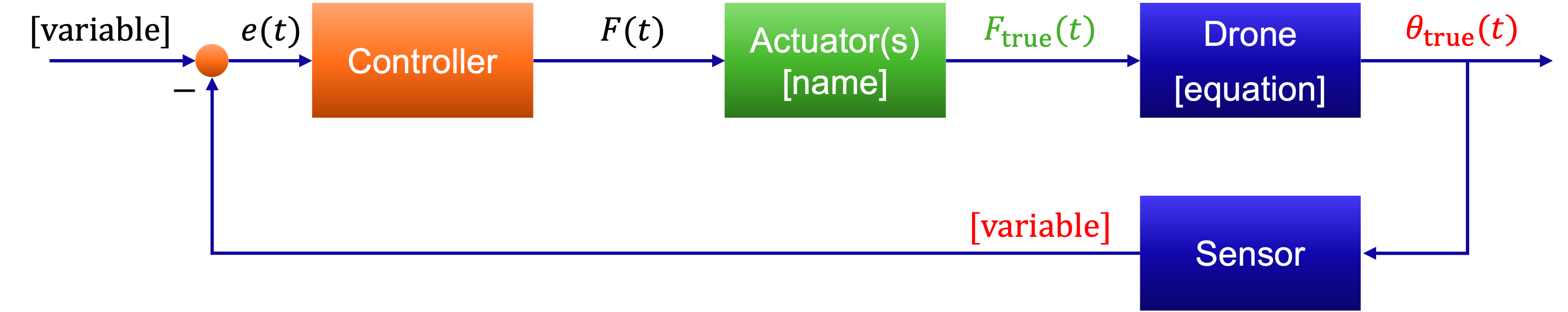 Fig. 6.23 Schematic of a feedback attitude loop, reference input (variable) is compared to the measured angle to form \(e(t)\); the controller outputs \(F(t)\), actuators produce \(F_{\text{true}}(t)\), the drone dynamics map this to \(\theta_{\text{true}}(t)\), and the sensor feeds the measured variable back to the summing junction.#