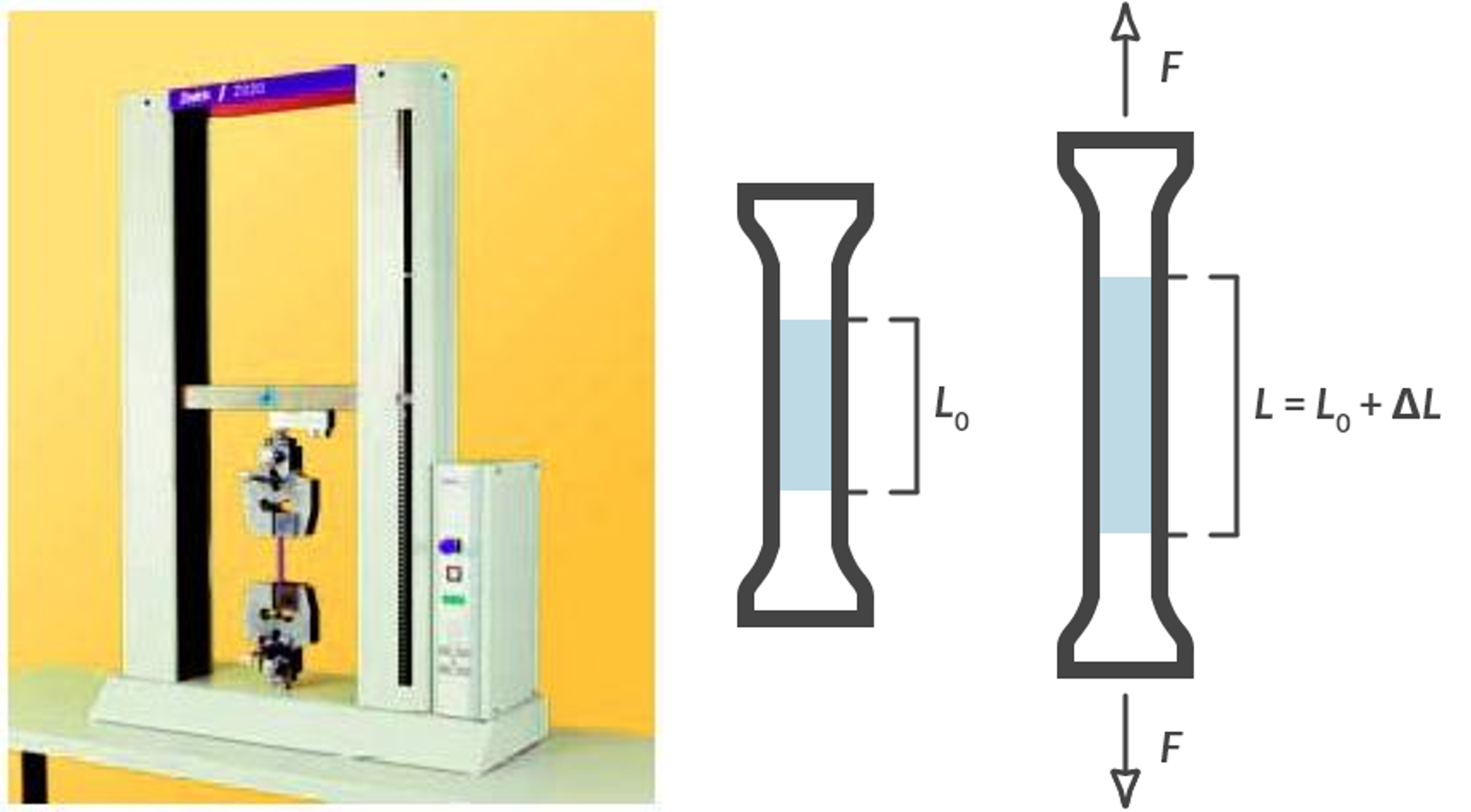 Fig. 2.2 (a) Tensile tester (source: Zwick), (b) tensile bar under load of a force \(F\).#