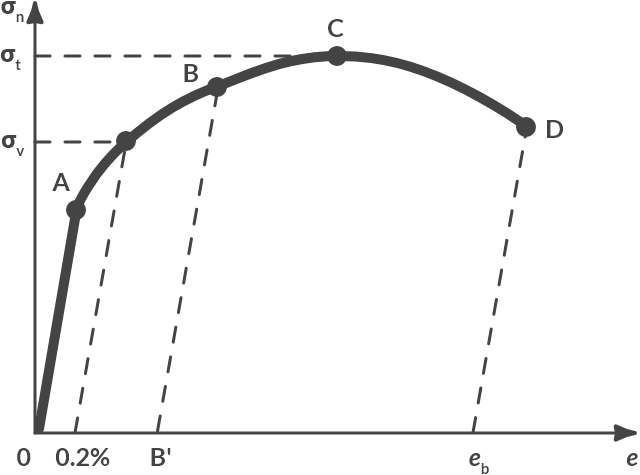 In the neck, the cross-section will quickly become smaller with increasing elongation, while the other parts of the bar will hardly deform further. The tensile force \(F\) and the stress n will become smaller. In point \(D\), the rod is weakened by the increased neck so much that it breaks. The permanent plastic elongation after fracture is the fracture strain or elongation at break \(e_b\) .