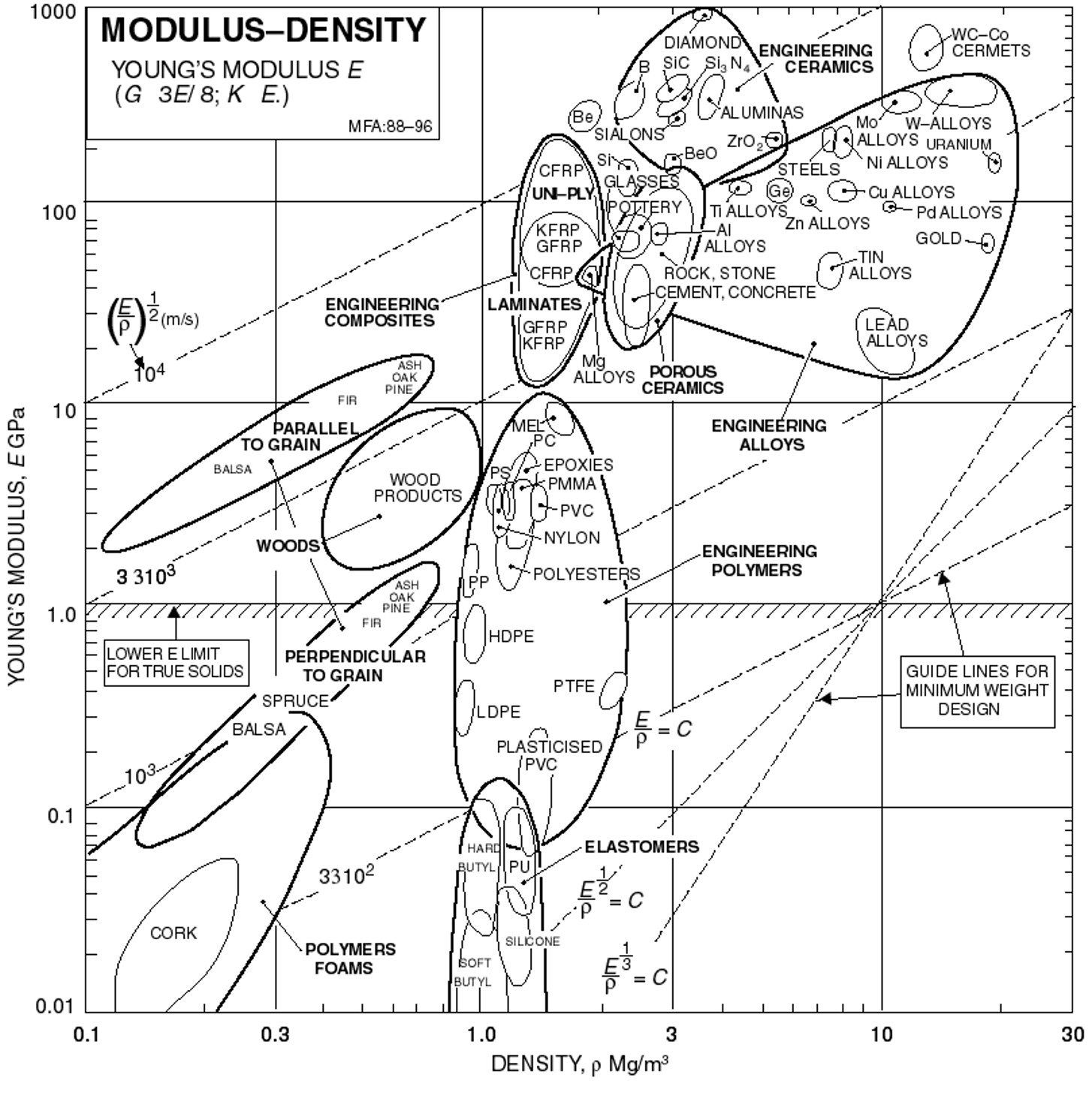 Fig. 2.19 Ashby-plot: Elastic modulus \(E\) versus density \(\rho\).#