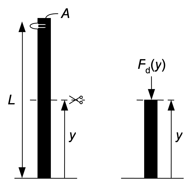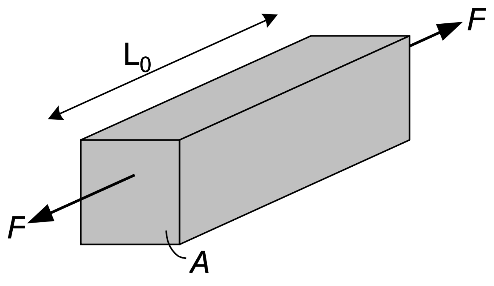 The proportionality factor \(k\) is called the stiffness of the bar. Experimentally it appears that the stiffness is proportional to the area of the cross-section \(A_0\) and inversely proportional to the length \(L_0\):