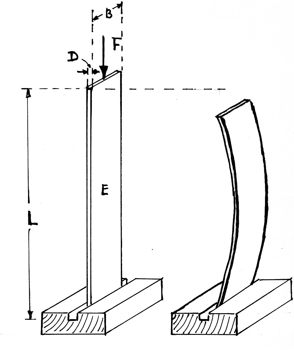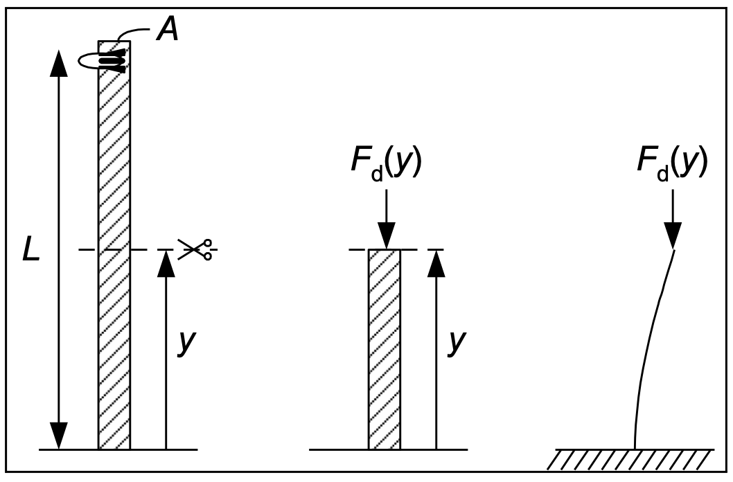 A plastic ruler in a gutter is illustrated in Fig. 2.17. To demonstrate buckling, a standing plastic ruler is considered with modulus of elasticity \(E\), which is placed at the bottom in a narrow channel (to prevent slipping) and which is pressed down vertically from above. The rotation on the underside is free, so that the buckling situation on the left from Fig. 2.8 may be assumed. Assume a length \(L\), a thickness \(D\) and width \(B\) (all in m).