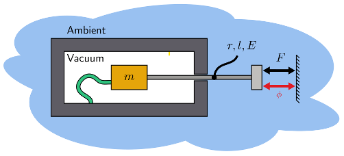 Fig. 2.25 Conceptual diagram of the proposed external actuation setup. A steel rod with radius \(r\), length \(l\), and material properties \(E\) and \(\sigma_y\) transmits a force \(F\) from outside the vacuum vessel to drive the stage of mass \(m\), while the displacement \(\varphi\) is measured.#